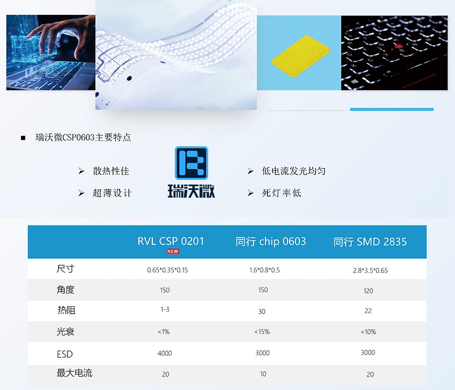 在现代电子设备设计中,背光不仅是功能性的需求,更是提升用户体验的关键。瑞沃微推出的高光效、小尺寸CSP0603灯珠,以其紧凑的封装尺寸与优异的亮度表现,为各类空间受限的应用提供了理想的照明解决方案。