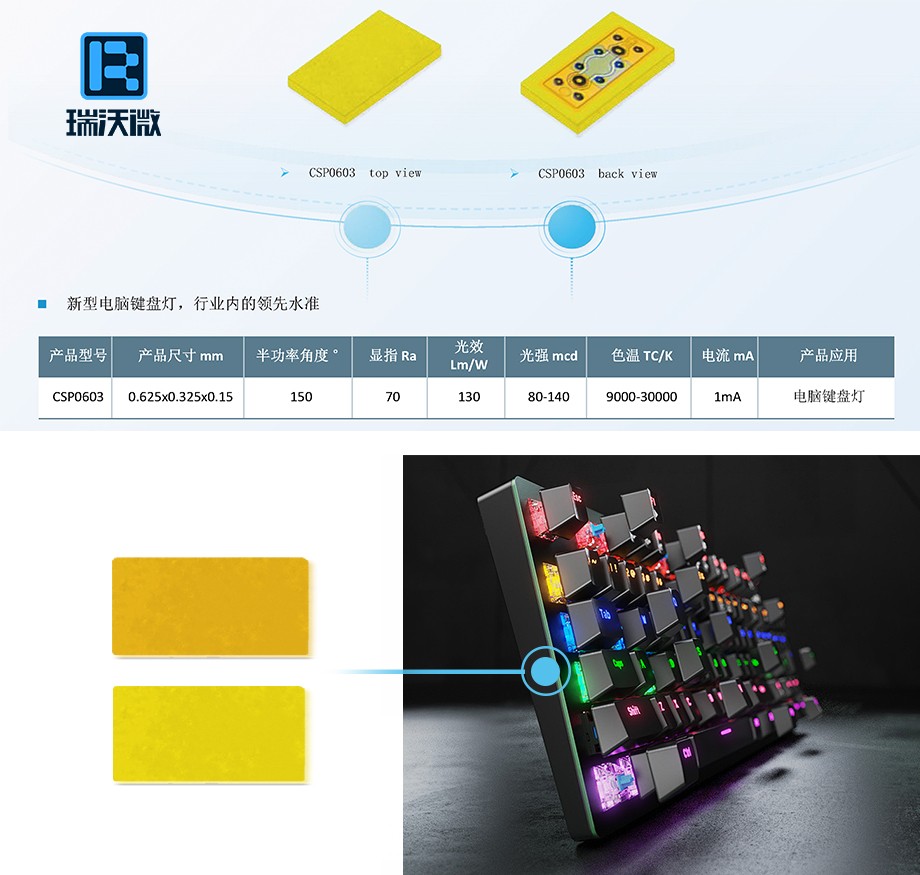 瑞沃微CSP0603灯珠以其“小尺寸、高光效”的鲜明特点,不仅解决了空间限制下的工程难题,更开启了背光设计在功能与体验上的全新可能。它让背光键盘超越了基础的照明需求,进化为一个智能、友好且富有表现力的人机交互节点,充分印证了在现代电子设计中,细微之处的创新,往往能点亮卓越的用户体验。